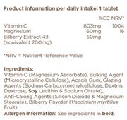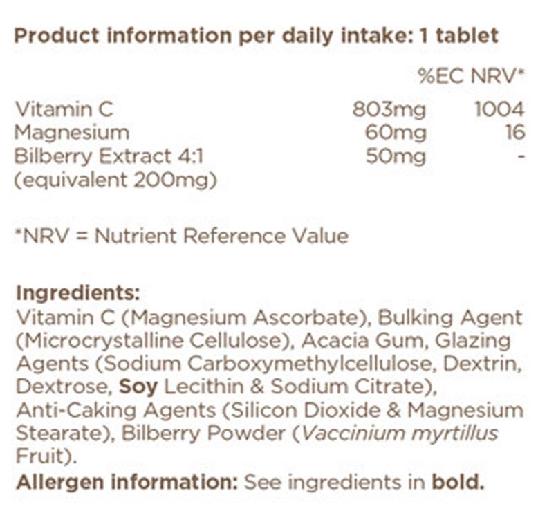 High potency, low acid form of vitamin C with bilberry extract in a convenient one a day tablet